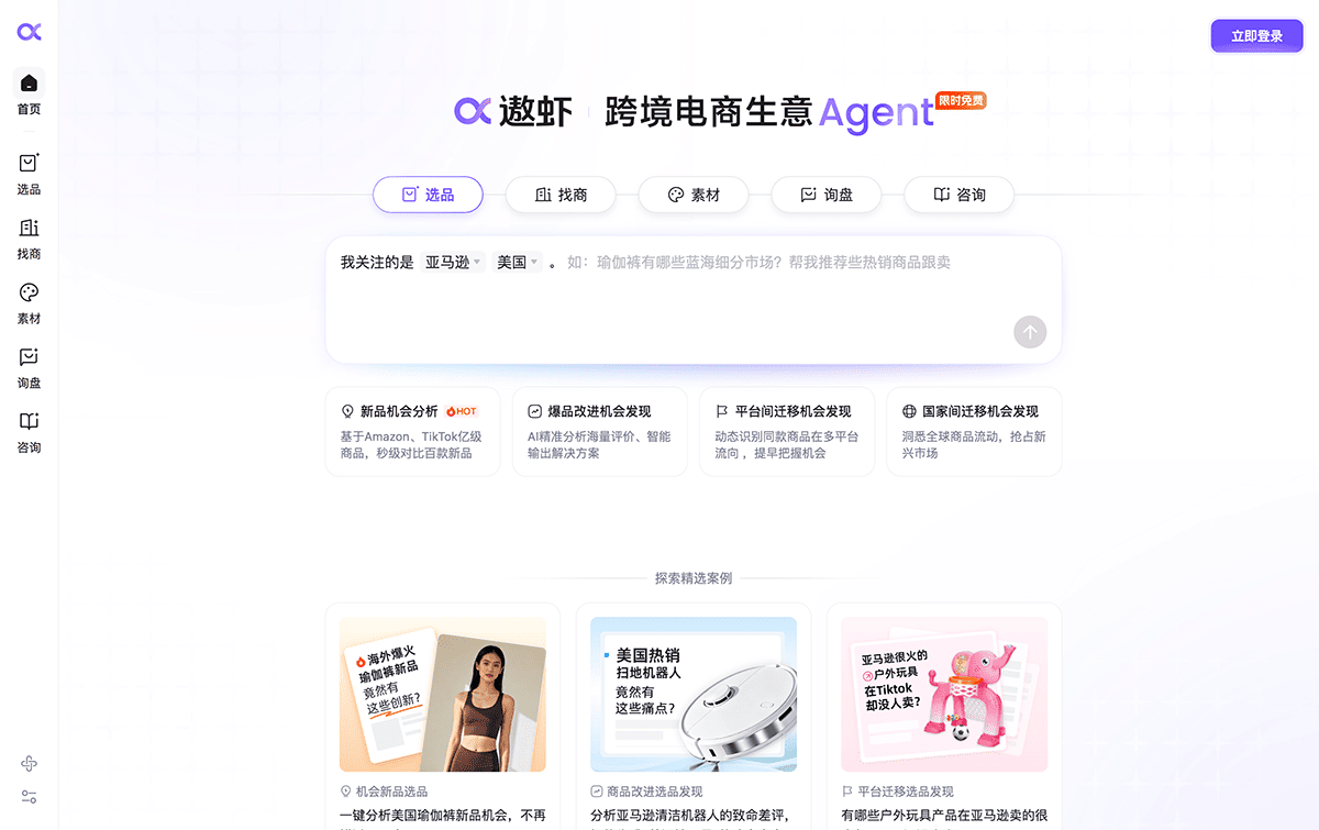 提供“选品‑找厂‑询盘‑设计‑合规”等跨境贸易关键环节全流程智能体,智能节省人力,效率创造利润。