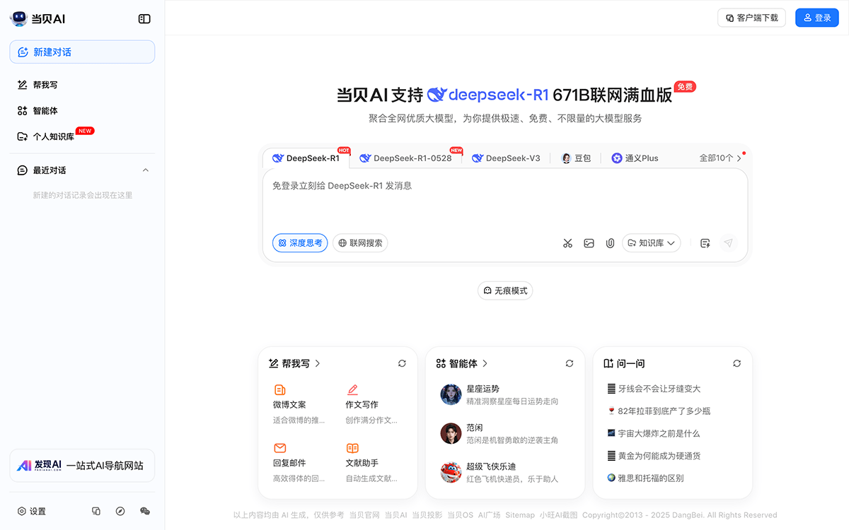 当贝AI是一款全能AI助手,通过AI技术为你提供工作、生活、娱乐等全方位的支持。当贝AI集合了国内头部大模型,如DeepSeek、通义千问、豆包、智谱等,用户可以自由选择使用,免登录体验DeepSeek满血版。同时当贝AI还提供了海量技能智能体,包含工作、生活、影视人物等,且不断上新中。当贝AI支持APP、电脑端网页、H5 等多端设备,可以满足不同场景使用需求。