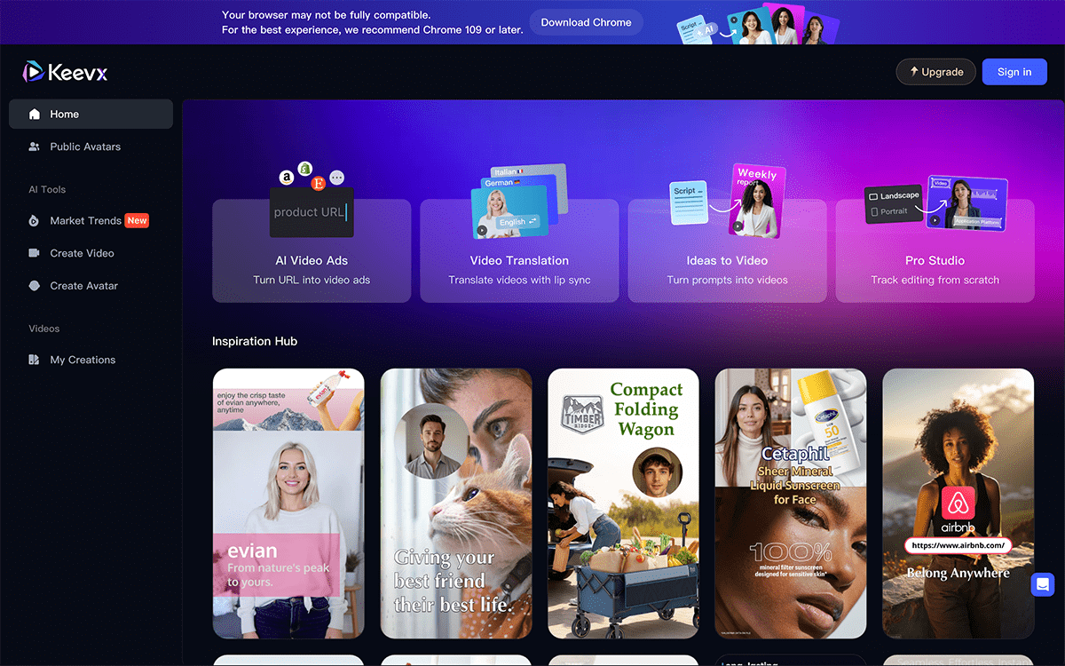 借助 URL 解析、AI 脚本生成与爆款视频复刻,Keevx AI可以在数分钟内完成视频制作,满足高频率、大规模的内容需求。