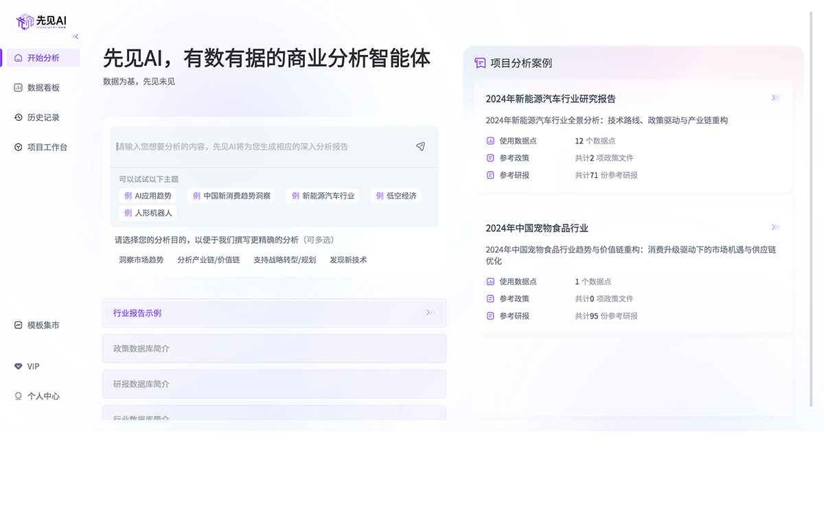 先知AI依托全面的产业数据、市场研报及政策信息,结合AI强大的分析能力,能够为企业提供精准的商业决策支持,将复杂的市场研究工作简化,提高效率。