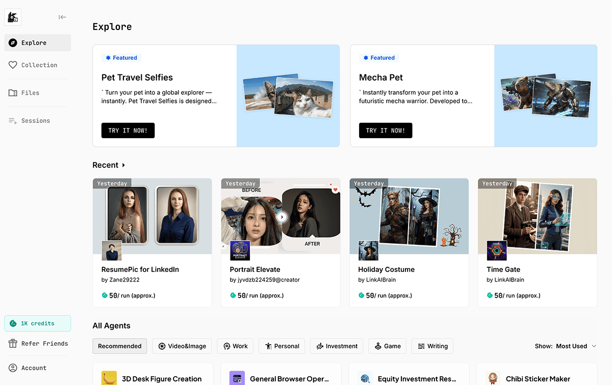 MuleRun提供多种即插即用的AI 工具,用户可以轻松发现、浏览和使用 AI Agent,无需复杂设置,只需选择并运行所需工具即可完成任务。