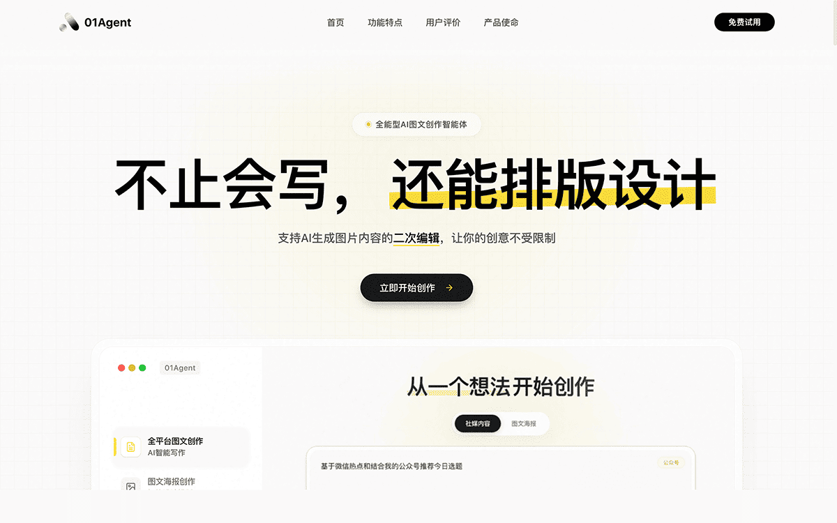 只需提供选题或关键词,01Agent即可完成文字撰写、配图生成、排版美化,并输出可直接发布的成稿,帮助创作者高效产出高质量图文内容。