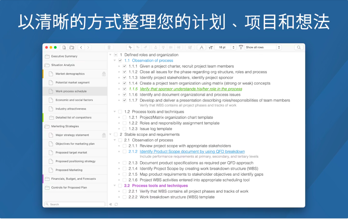 丰富的导入导出功能:用户可以通过多种方式共享数据,包括 PDF、OPML、HTML、纯文本、电子邮件甚至纸质副本。