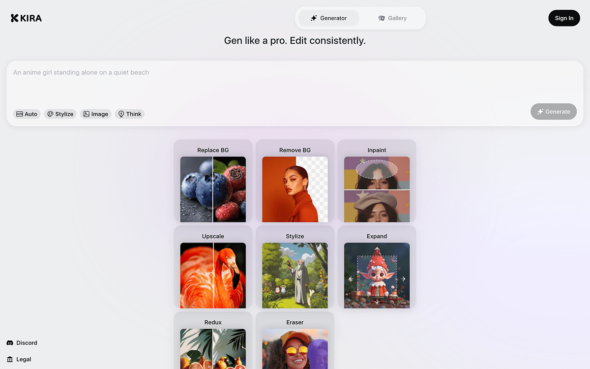 Kira是一个基于AI技术的创意图片生成与图像编辑平台,可以帮助用户进行基础图像处理及高级艺术创作。Kira融合了先进的深度学习算法与用户友好的交互设计,任何用户都能轻松上手,释放创造力。Kira支持多种图像处理功能,包括背景替换、背景移除、画质增强、风格转换、图像扩展、重做、橡皮擦、生成和画廊等,可以帮助用户高效地完成图像处理和创意设计任务。