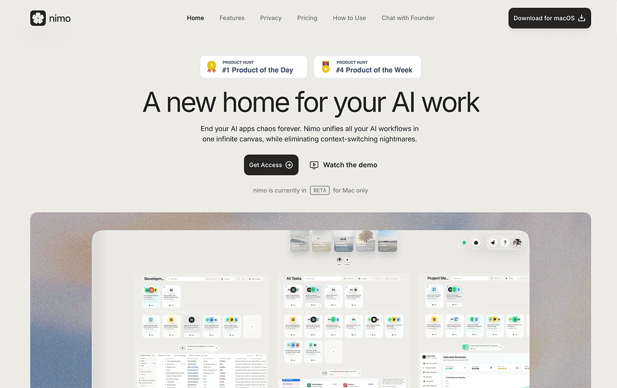 Nimo(nimo.space)是一款智能画布式AI生产力平台,Nimo把AI应用、智能体工具和日常生产力工具统一到无限画布界面,帮助用户在同一界面内完成信息检索、数据处理、自动化任务和协同编辑等操作,让工作流变得更连贯、更可视化。Nimo每个功能以AI卡片呈现,用户可以直接在卡片里进行对话、更新文档、生成报表或执行自动化任务,支持上下文记忆和多步骤执行,并且能够随时切换、组合使用,真正实现一站式协作。