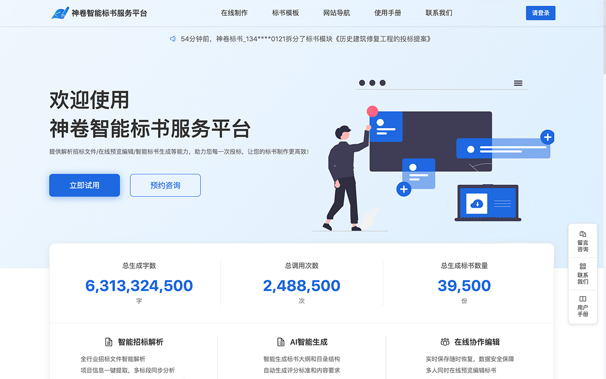 神卷标书采用全平台适配的云端架构,无需下载安装任何软件。用户通过电脑端或手机浏览器访问官网,完成简单注册后即可开启智能标书创作之旅。